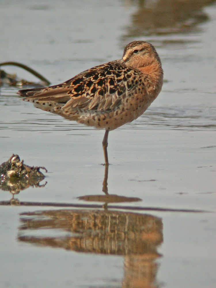 Out on the sandy beaches, I found five dowitchers, all sleeping, with long bills tucked over their shoulders into their feathers. Some were standing on two legs, some on one leg. I was amused to see that as the tide came in, the one-legged individuals just hopped a few steps up-beach without bothering to lower the second leg—which of course was fully functional but resting comfortably up in the belly feathers. I’m not sure the birds even came fully awake—they seemed to go right back to sleep.