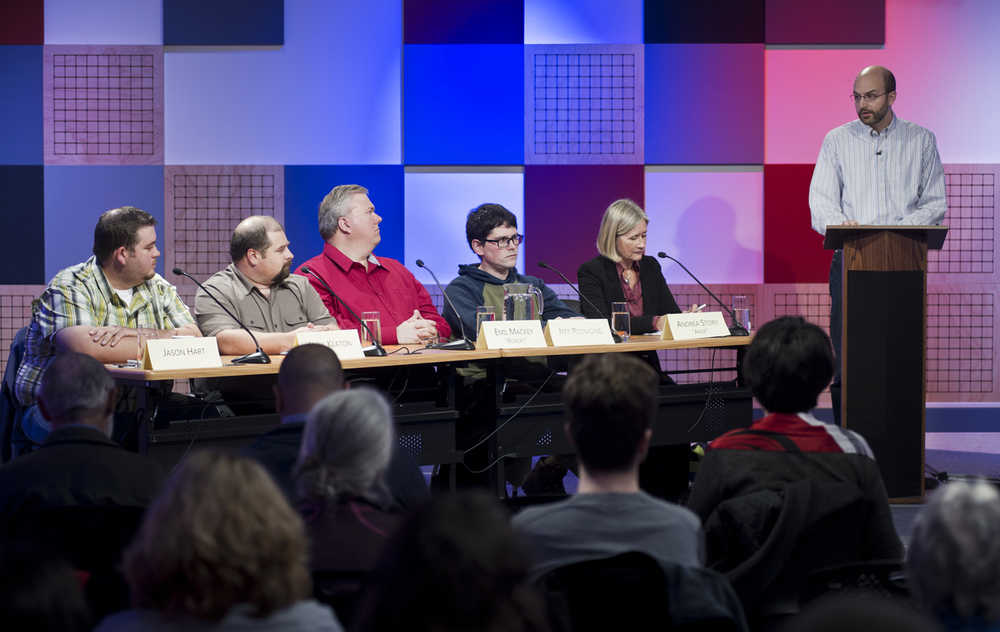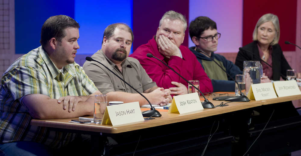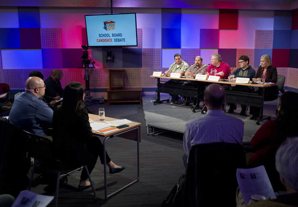 Juneau District School Board candidates answer questions from KTOO's reporter Lisa Phu and the Juneau Empire's managing editor Charles Westmoreland during a Juneau Votes! debate at the @360 Studio on Monday. The candidates from left are: Jason Hart, Josh Keaton, Emil Mackey, Jeff Redmond and Andi Story.