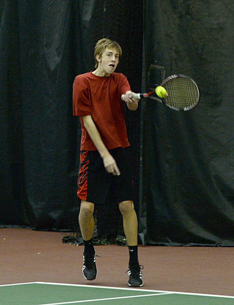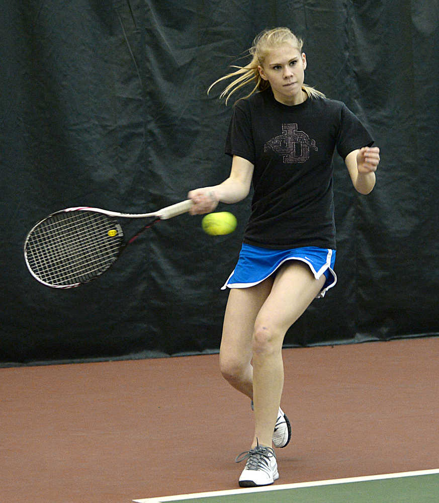 Juneau-Douglas High School junior Sami Good hits a forehand during the Region V tennis tournament at the JRC/The Alaska Club Valley on Thursday. Play continues today from 11:30 a.m. to 2:30 p.m. The boys singles semi-finals is scheduled for 11:30 a.m. and the final at 1 p.m. The girls singles championship is scheduled for 1 p.m. The mixed doubles final is scheduled for 2:30 p.m.