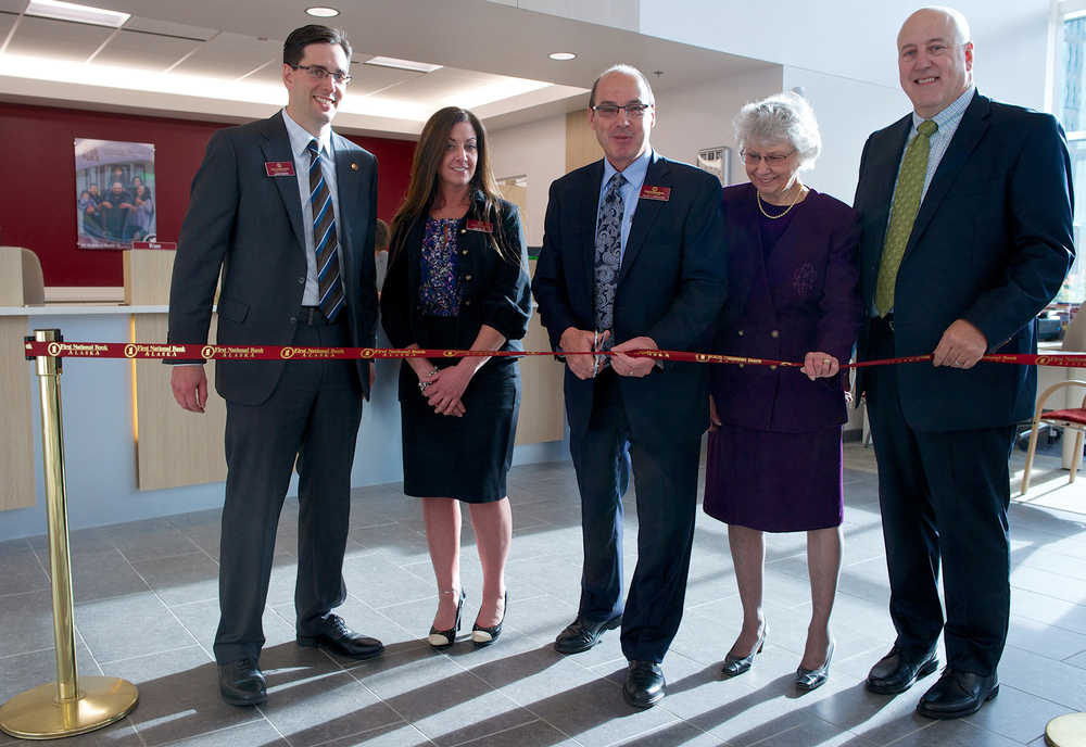 First National Bank Alaska leaders cut the ceremonial ribbon today at the bank's new Juneau Regional Branch to kick off a month-long grand opening celebration. (LtoR)Regional Branch Manager Luke Fanning, Juneau Regional Branch Manager Jodi Meyer, First National Executive Vice President Doug Longacre, Personal Banker Jo an White, and Senior Vice President Charlie Weimer perform the honor.