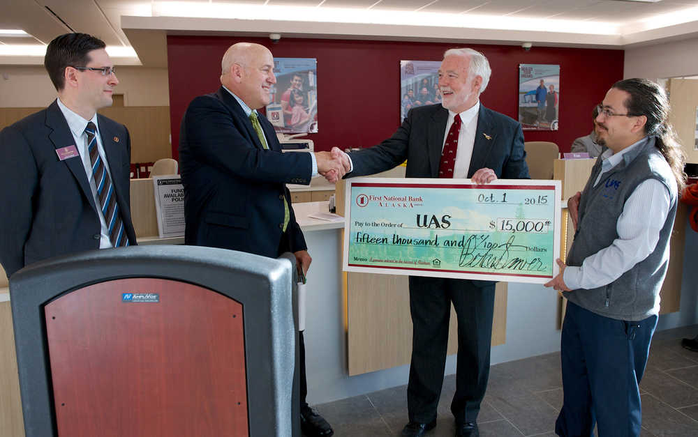 First National Bank Alaska demonstrated its commitment to the future of Alaska and to the Southeast region at its ribbon cutting ceremony for the new Juneau Regional Branch today. At the ceremony, Regional Vice President Luke Fanning (l) and Senior Vice President Charlie Weimer, presented $15,000 to Chancellor Rick Caulfield and Vice Chancellor Joe Nelson for the university's "Getting Ready for College" program.