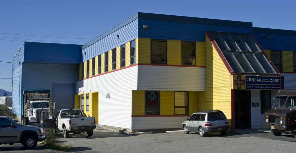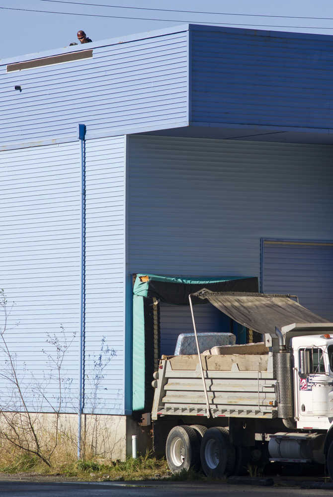 In these Oct. 2 photos, a North Pacific Erectors employee makes final repairs on the roof of Juneau Rental Space. The roof collapsed Sept. 21, causing visible buckling on the side of the building. The damage did not affect business in the Juneau Urgent & Family Care offices, which shares the building with Juneau Rental. Gale Lund, the building manger and clinic administrator for Urgent Care, said the area was vacant when the collapse occurred, causing no injuries.