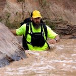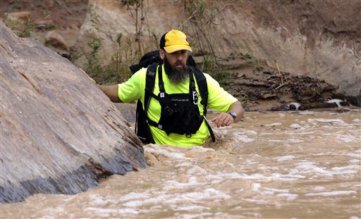 In this Sept. 16, 2015 file photo, a member of a search and rescue team wades in to Virgin River during a search in Zion National Park, near Springdale, Utah. Zion National Park officials are retracing what led up to the deaths of seven people in a flooded canyon on Sept. 15 before a panel assesses what can be done to keep a growing number of visitors safe when spectacular natural settings turn perilous.