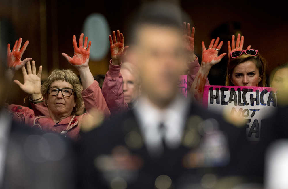 Anti-war protesters sat in the front row of the hearing with red coloring, depicting blood, on their faces. They carried signs that read: “Health care not warfare” and “Kunduz victims: RIP.” A woman who shouted “Bombing hospitals is a war crime! Stop the bombing now!” was escorted from the room.