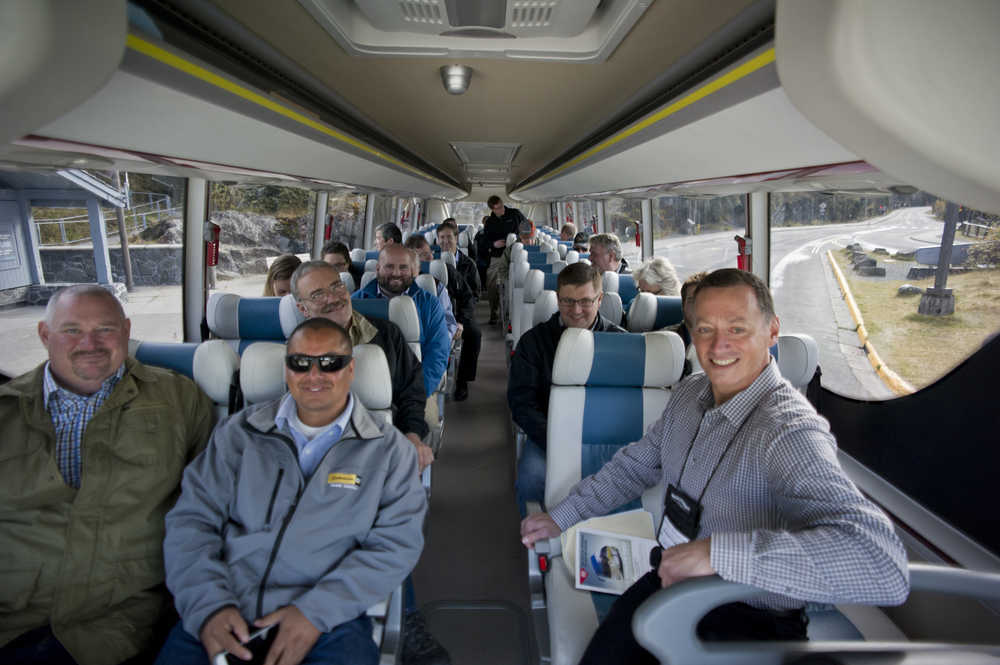 Dennis McDonnell, President of Alaska Coach Tours, right, and other attending the Alaska Travel Industry Association's Annual Convention & Trade Show ride an electric motor coach provided by BYD Auto Co., Ltd., a Chinese automobile manufacturer based in Shenzhen, Guangdong Province, to the Mendenhall Glacier Visitors Center to showcase the potential for electric vehicle bus transportation as part of the tourism industry in Alaska on Tuesday.