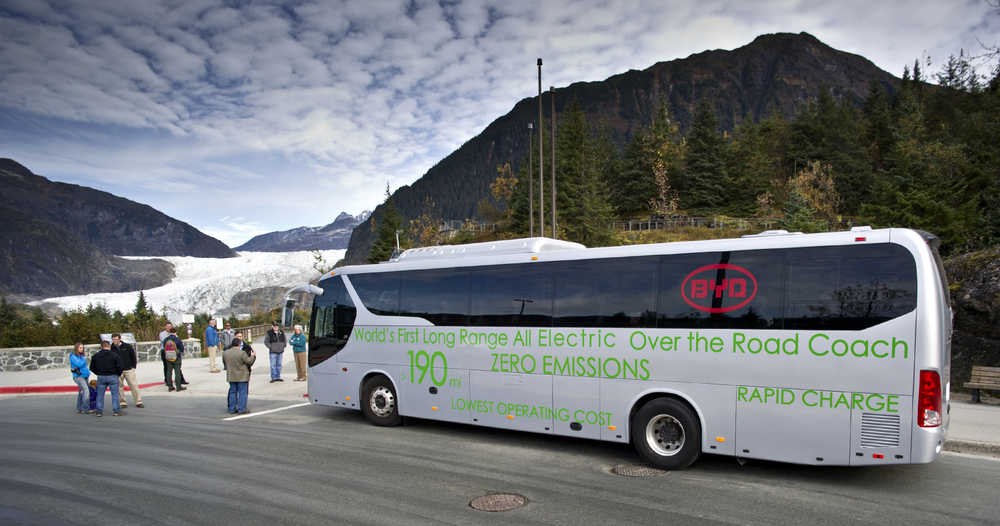 An electric motor coach provided by BYD Auto Co., Ltd., a Chinese automobile manufacturer based in Shenzhen, Guangdong Province, and Alaska Coach Tours stops at the Mendenhall Glacier Visitor Center to showcase the potential for electric vehicle bus transportation as part of the tourism industry in Alaska on Tuesday.