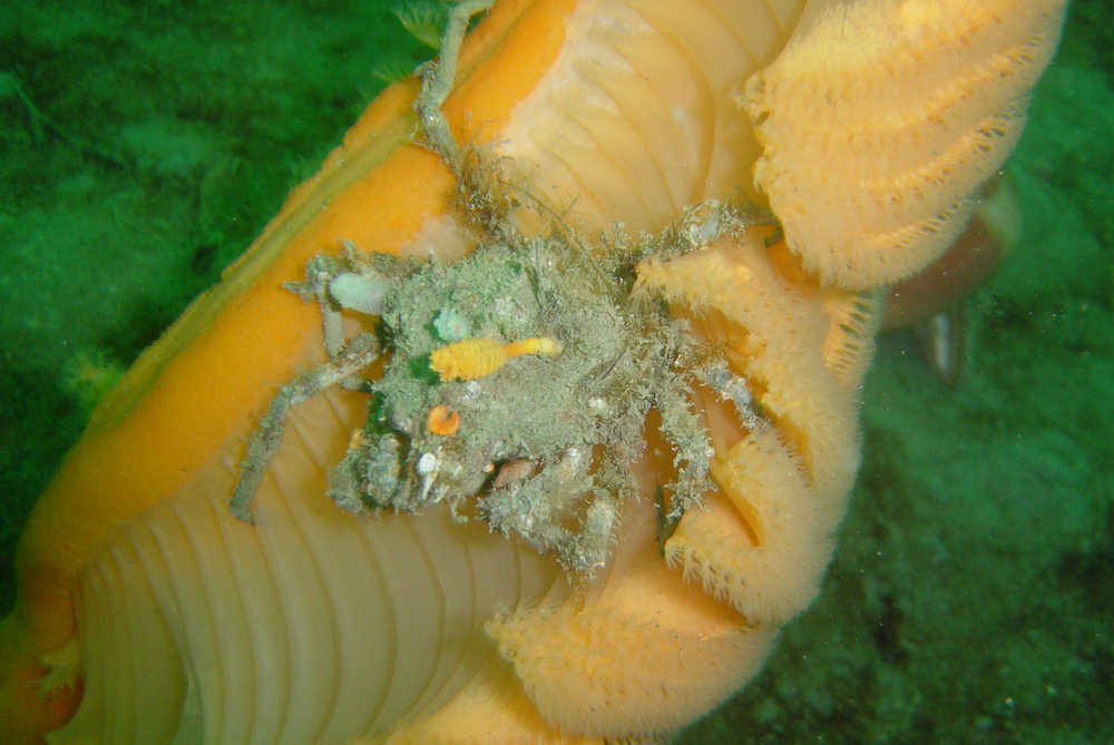 A decorator crab rests on a large sea pen. This crab has included a tiny sea pen in its decorations.