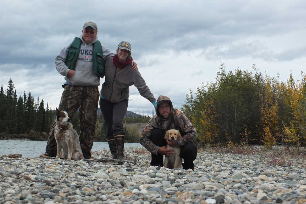 From left to right, Loki, Nils Dihle, Mary Catharine Martin, Bjorn Dihle and Fen pause for a photo shortly after shooting some rapids on the Big Salmon River.