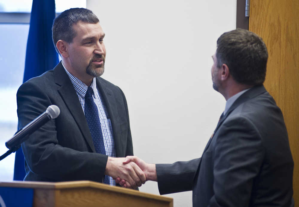 Outgoing president Lance Stevens, right, welcomes Dan Fabrello as the incoming president of the Juneau Chamber of Commerce at their weekly luncheon at the Juneau International Airport on Thursday.