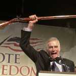 In this Oct. 21, 2002 photo, National Rifle Association President Charlton Heston holds up a rifle as he addresses gun owners during a "get-out-the-vote" rally in Manchester, New Hampshire.