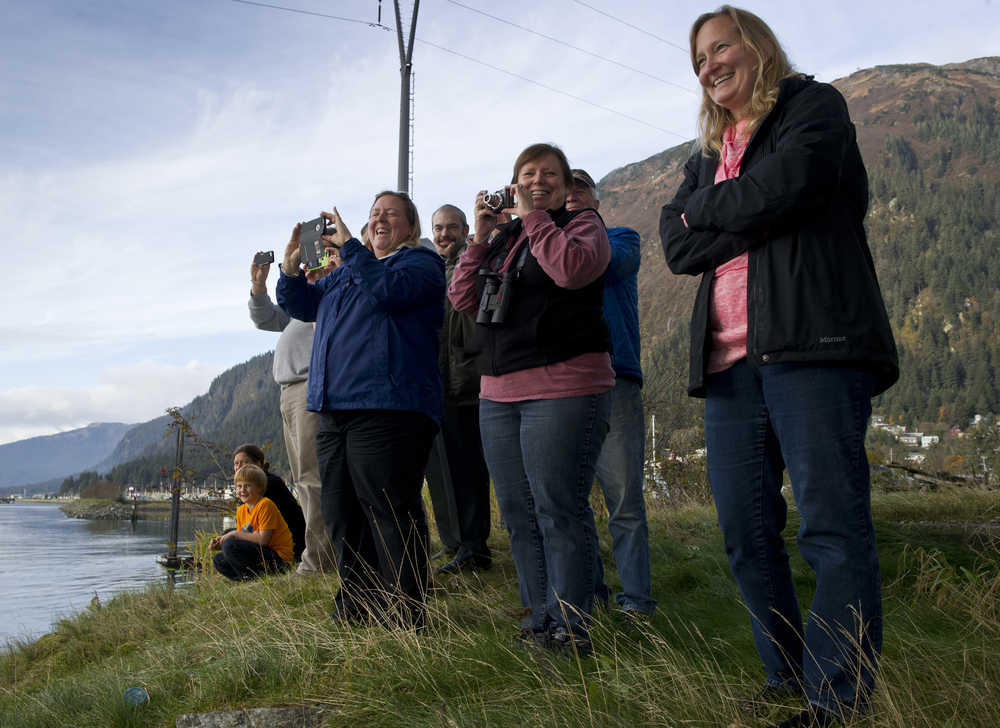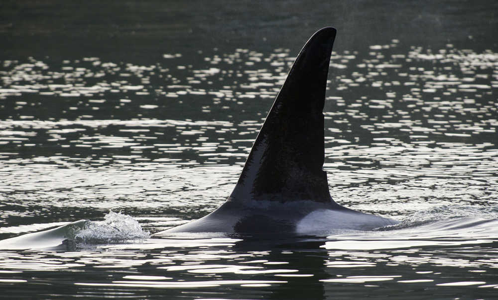 A bull orca surfaces near the Douglas Bridge as a pod of three toured Gastineau Channel on Wednesday.