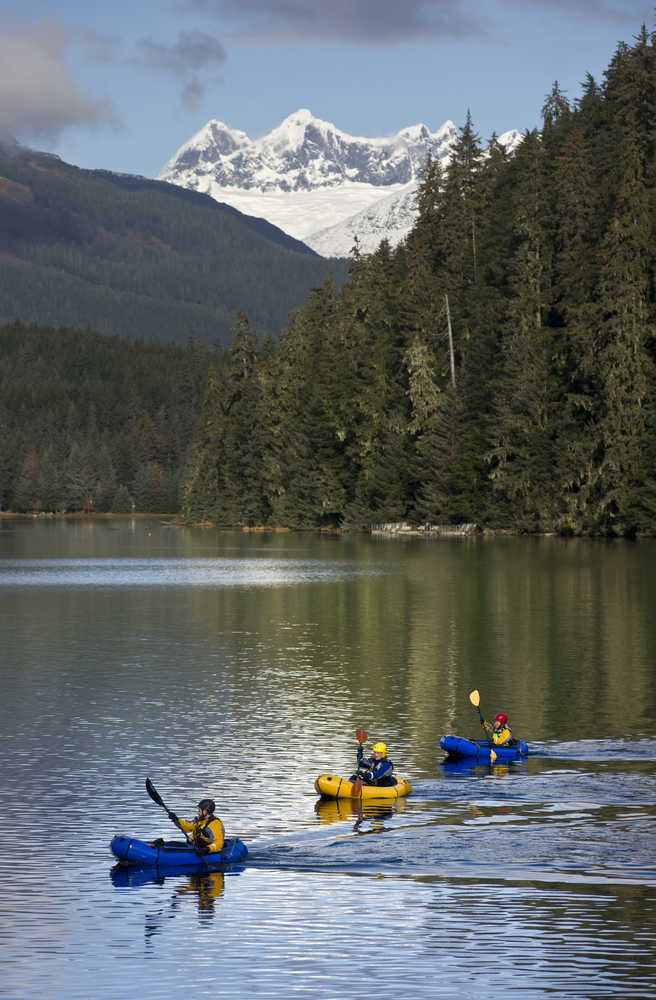 University of Alaska Southeast instructor Forest Wagner, left, leads Casey Burkert, center, and Makaila Olson across Auke Lake in pack rafts during his Outdoor Leadership Class on Wednesday.