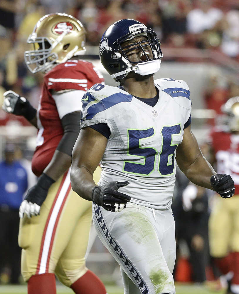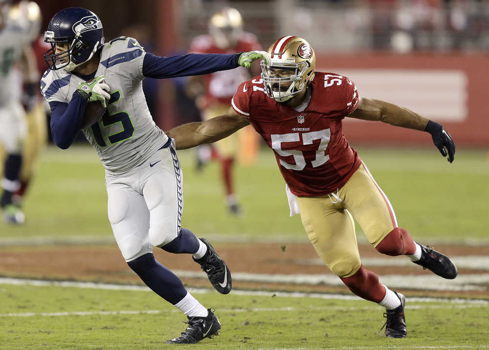Jermaine Kearse caught a 21-yard pass over a leaping NaVorro Bowman, facing Seattle for the first time since a frightening left knee injury in the NFC title game. He needed surgery and was sidelined all of last season.