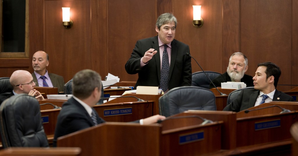 Rep. Sam Kito III, D-Juneau, welcomes legislators back to the Capitol and gives thanks to Pam Varni, executive director of the Legislative Affairs Agency, Jeff Goodell, Capitol building manager, and Dawson construction for their work getting the Capitol ready for the Special Session that started on Saturday.