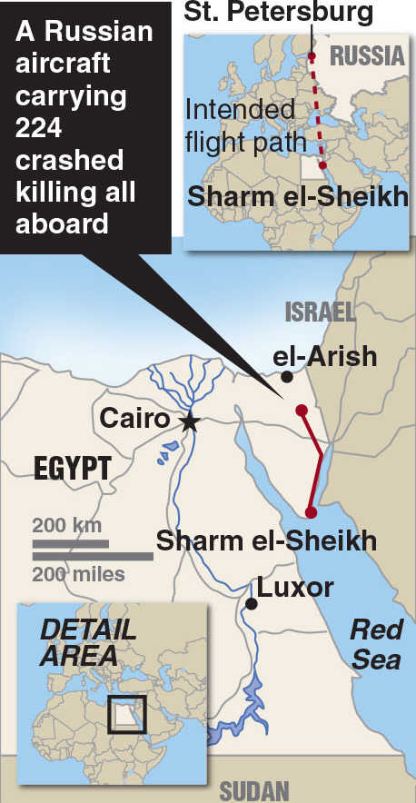 The Metrojet was flying from Egypt’s Red Sea resort of Sharm el-Sheikh to St. Petersburg when it crashed in the Sinai Peninsula after breaking up at high altitude, Russian aviation officials said.