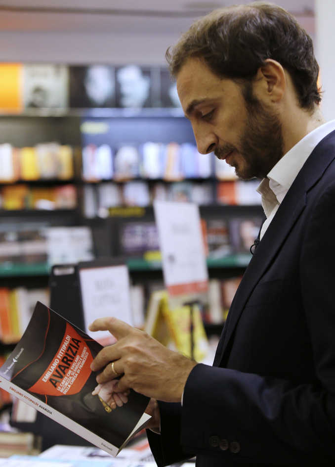 Italian journalist Emiliano Fittipaldi browses through his book titled " Avarice" in a Rome's bookstore on Tuesday.