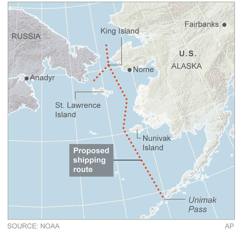 The proposed shipping lane starts at Unimak Pass in the Aleutian Islands, which sees upward of 5,000 transits annually, mostly cargo vessels operating between Asia and the U.S. West Coast.