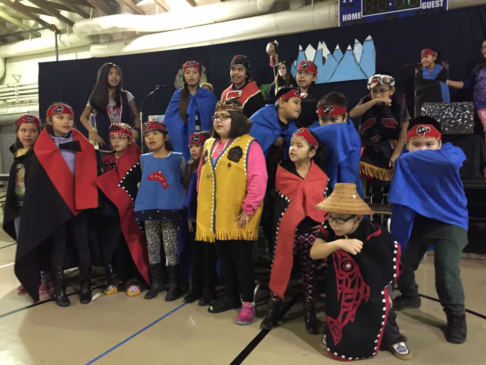 Students from Angoon presented their original play “Raven Stole the Sun” Thursday in an all-school project led by Gustavus artist Sarah Campen through the Artists in the Schools program. Junior high and high school students wrote the script after studying traditional versions of the story, and elementary school students created backdrops and props.
