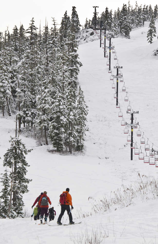Skiers skin up through fresh snow at Eaglecrest on Monday.