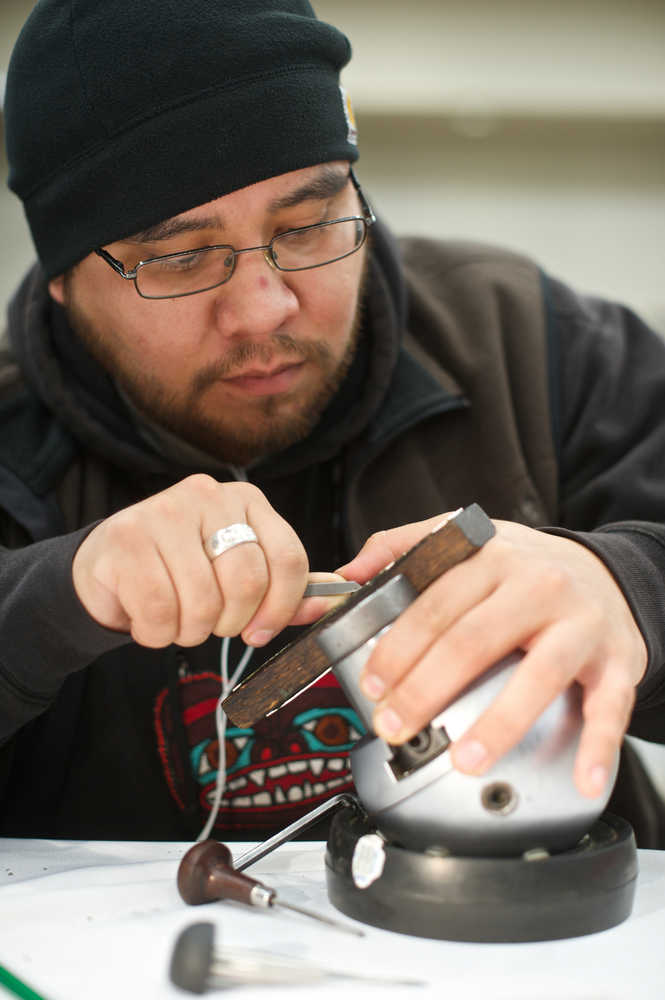 Samuel Sheakley, Sr., works on a silver piece at the Native Artists Market in the Elizabeth Peratrovich Hall in Nov. 2014.