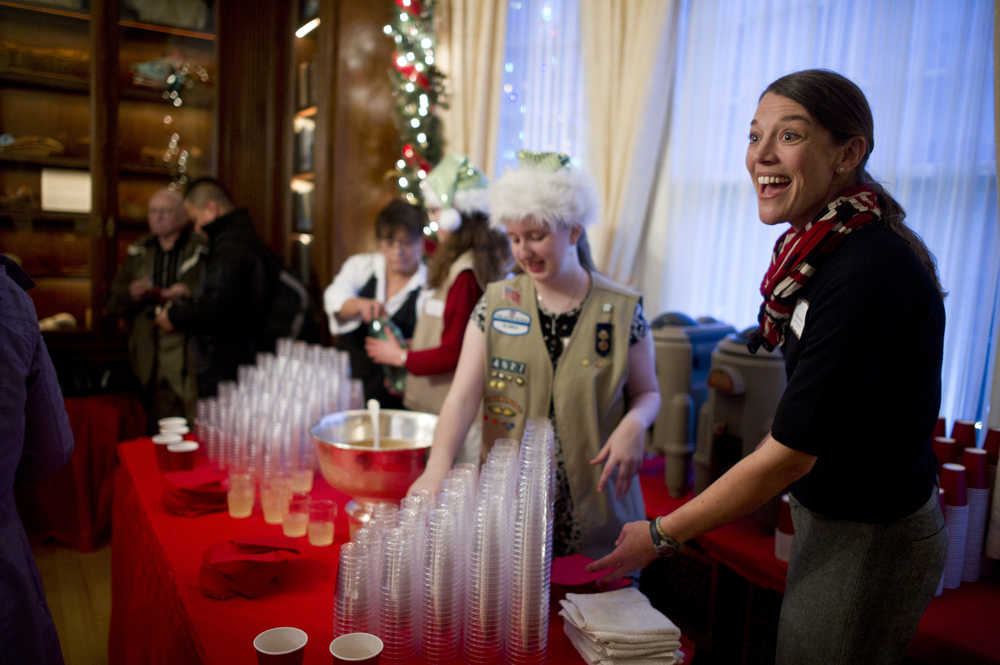 Amanda Mallott helps the Girl Scouts serve hot and cold apple cider during the Governor's Open House on Tuesday.