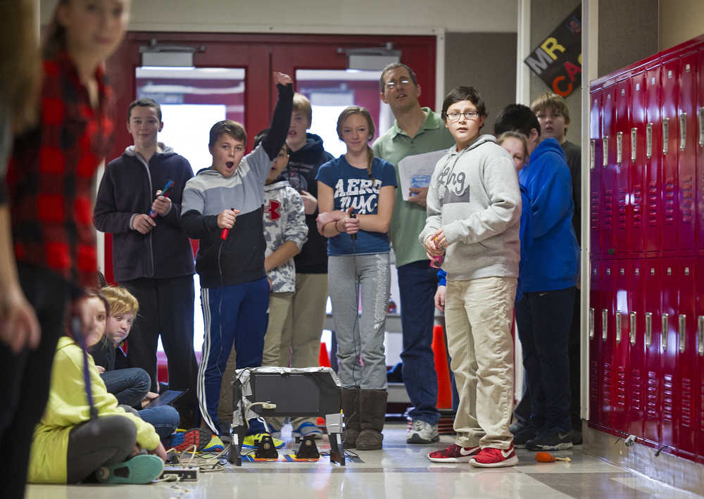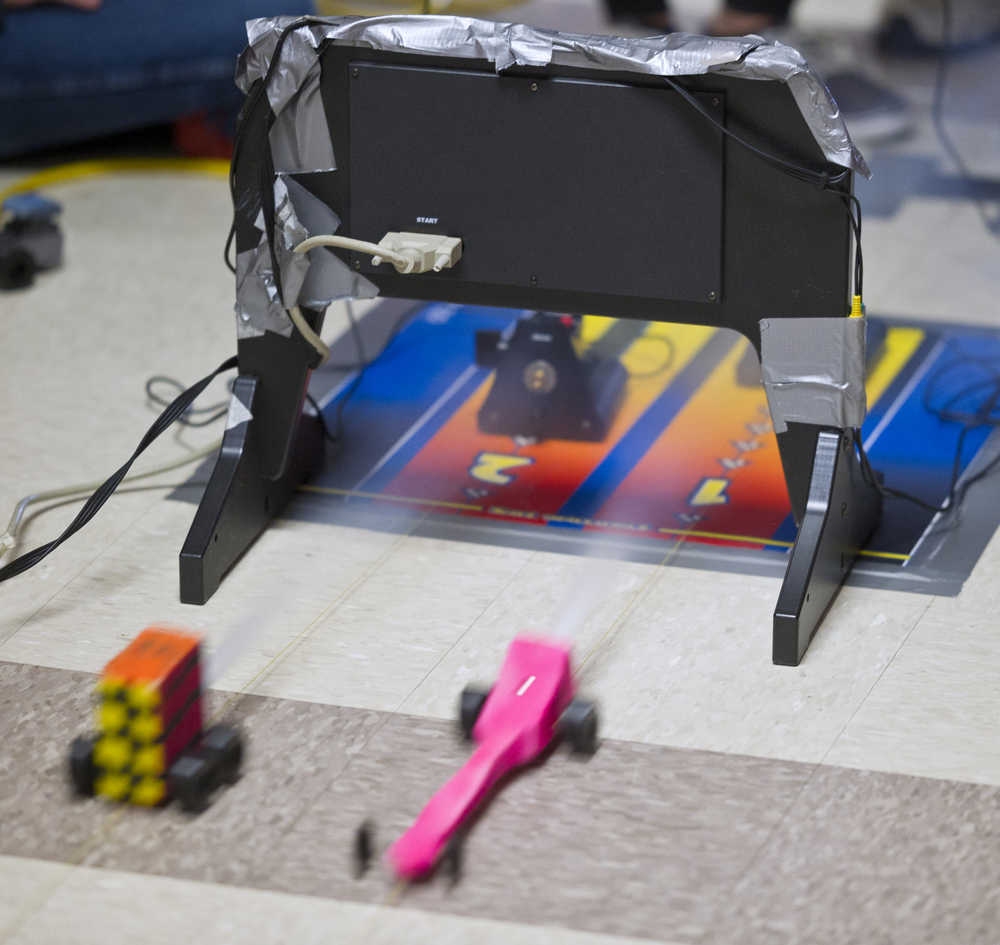 Racing cars made by eighth grade students in teacher Alan Denerger’s technology class at Floyd Dryden Middle School on Thursday. The wooden cars are powered by a CO2 cartridge and are raced at up to 60mph along a fishing line in the hallway.