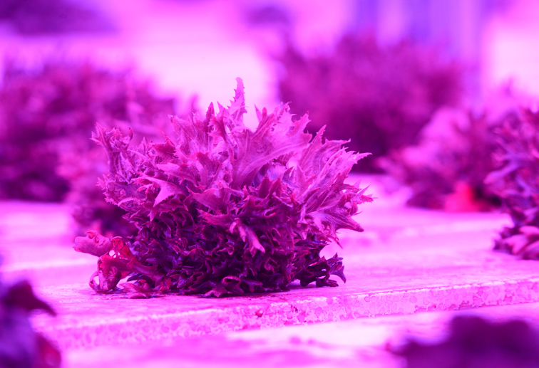 But things are looking good in the interim. Smith picked up a tray of red oak-leaf lettuce growing under red and blue lights and inspected the roots peeking out from the tray. Despite being only seedlings, a mass of white root tendrils poked out the bottom. With no soil, a robust root system means healthier plants that can better absorb the liquid nutrients that Smith provides.