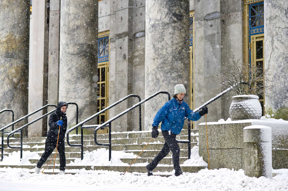 Jan Rutherdale and her daughter, Isabel Bush, ski past the Capitol during Monday’s snow showers. The National Weather Service forecast for Tuesday calls for numerous rain and snow showers. Snow accumulation to 1 inch. Highs 32 to 36. West wind 10 to 15 mph.