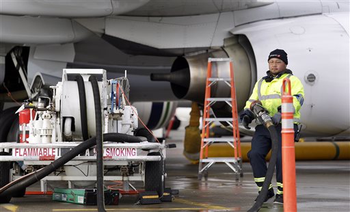 Airport worker Resky Killion stows gear after pumping fuel into an Alaska Airlines jet, Wednesday, Dec. 16, 2015, at Seattle-Tacoma International Airport, in SeaTac, Wash. Boeing Co., Alaska Airlines and the Port of Seattle announced Wednesday that they are partnering on a $250,000 study to explore how to bring more aviation biofuel to airplanes at Seattle-Tacoma International Airport. Executives for the companies and port signed an agreement, saying the study will help stimulate production of alternatives to conventional jet fuel. They say the longer term plan is to incorporate more biofuel into the airport’s fuel farm, which is used by all 26 airlines.