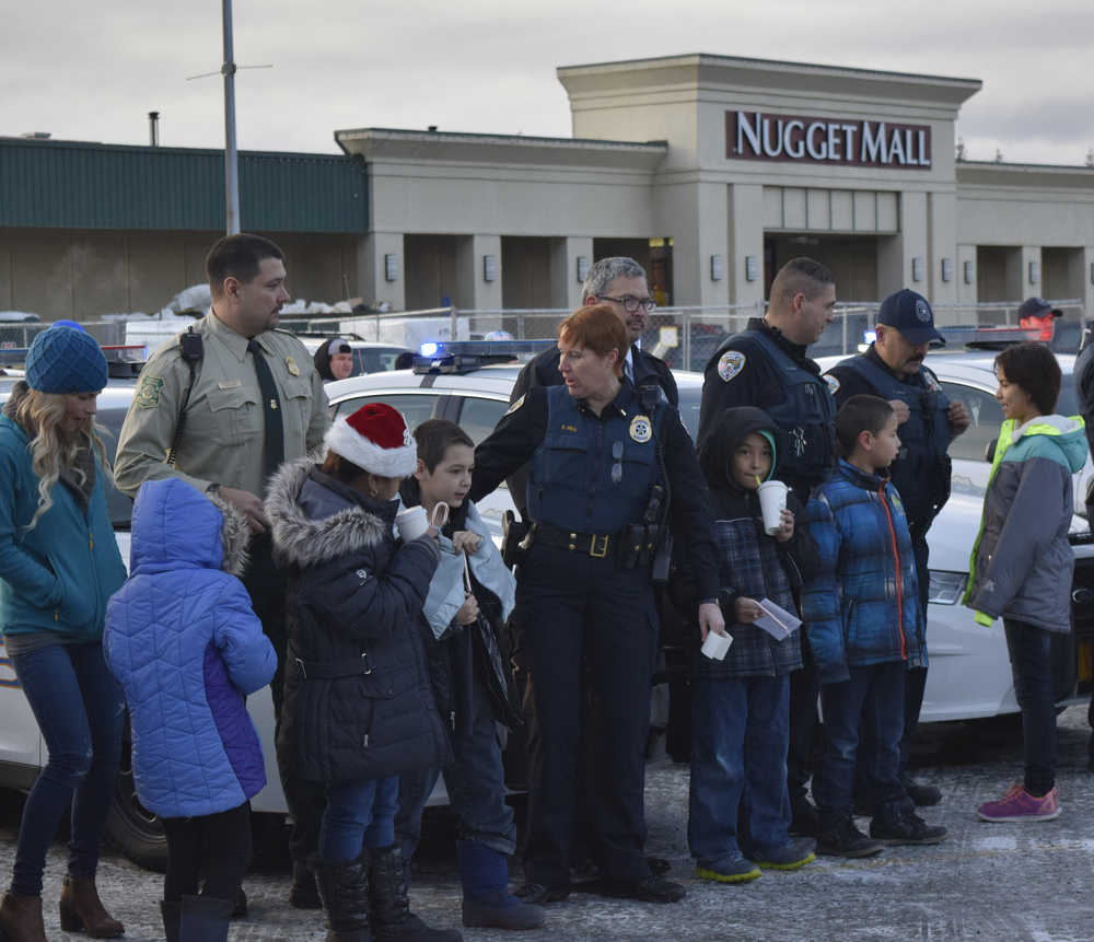 Law enforcement officials with the Juneau Police Department, Alaska State Troopers, Alaska Department of Corrections and U.S. Forest Service prepare to take local youth shopping in front of the Nugget Mall on Saturday.