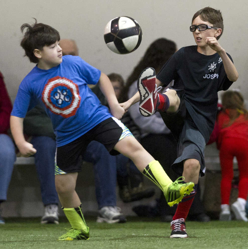 Nutmeggers' Liam Kelly, left, and Snowflake United's Joseph Aline duel for the ball during their elementary division game in the 2015 Holiday Cup at the Dimond Park Fieldhouse on Tuesday.