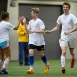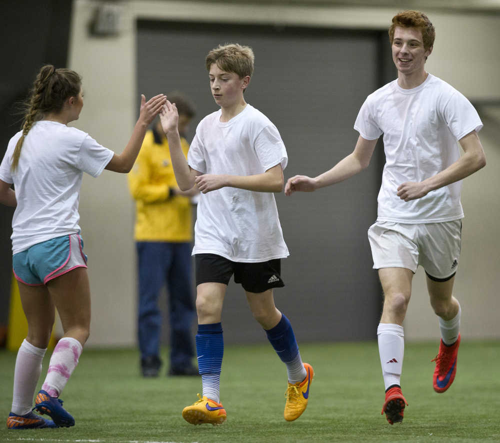 MC Dreidel’s Jackson Norberg, center, celebrates with teammates Abby DeRocher, left, and Corbin Mitchell after his score against the South Pole Elves during their high school division game in the Holiday Cup at the Dimond Park Fieldhouse on Tuesday.