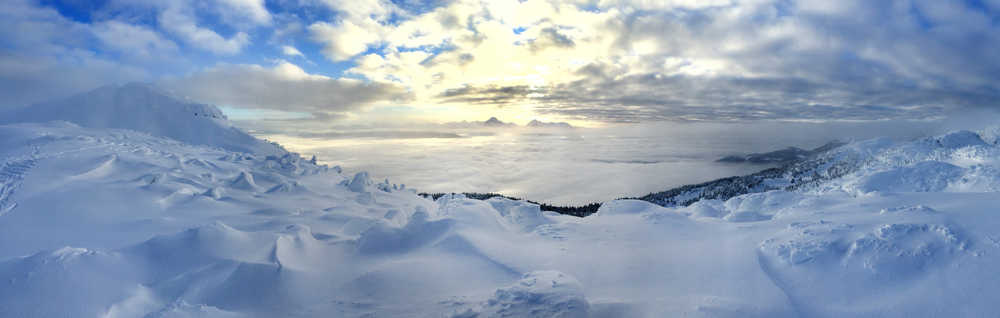 The sun begins to dip behind the clouds over Eagle Peak on Admiralty Island on Sunday at 1pm. This photo is a panorama taken from the East Ridge at Eaglecrest.