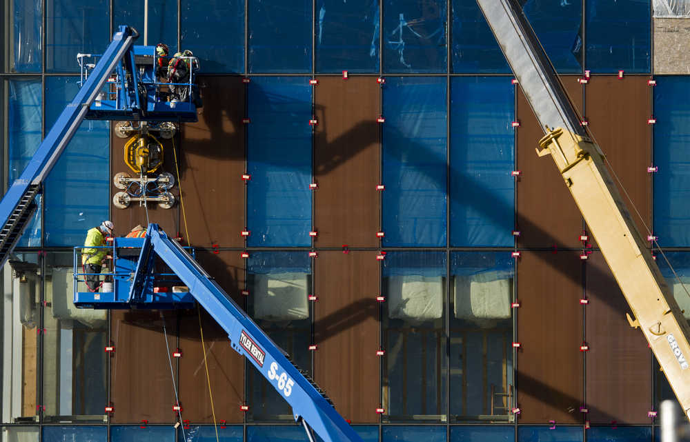 PCL Construction employees install panels onto the front of the State Library, Archives, and Museums building in October.