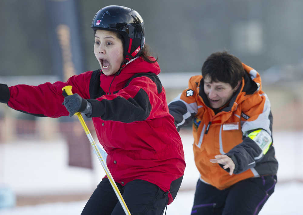 Jeorghette Plang, left, reacts to ski instructor Leslie Antolick’s helpful push during the the World’s Largest Lesson at Eaglecrest on Friday as part of Learn to Ski and Snowboard Month. The event, that included 80 participants and 17 instructors, was part of a national attempt to break a Guinness World Record.