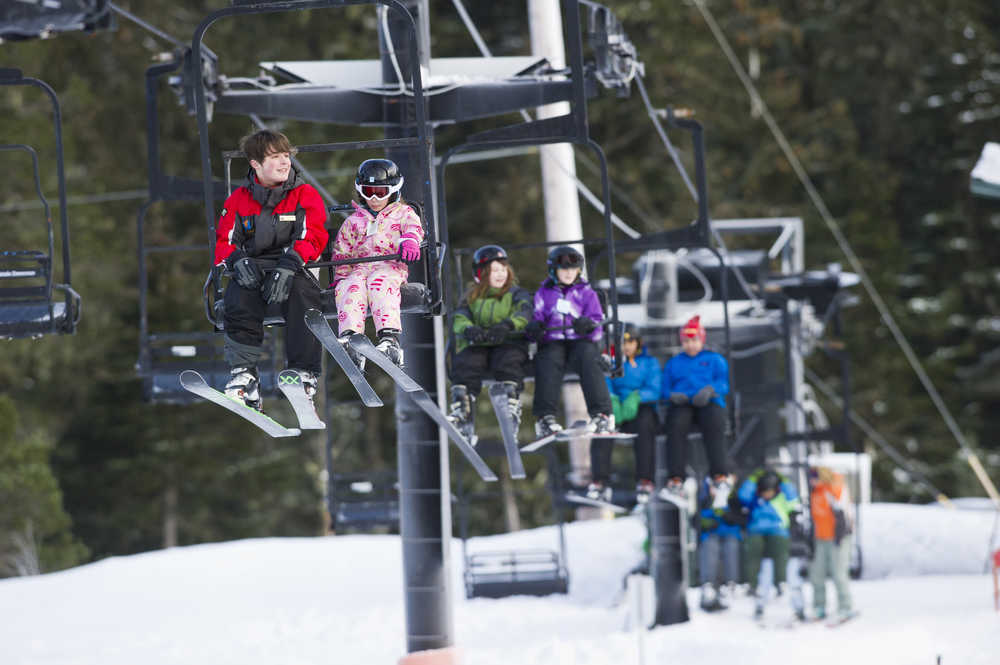 Students and instructor ride the Porcupine Chairlift as they participate in the the World's Largest Lesson at Eaglecrest on Friday as part of Learn to Ski and Snowboard Month. The event, that included 80 participants and 17 instructors, was part of a national attempt to break a Guinness World Record.