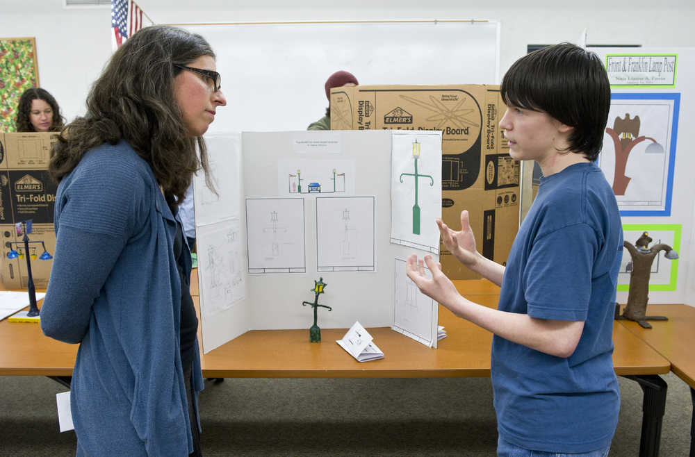Freshman Elijah Rodriguez explains his design and lighting concept to Michele Elfers, a project manager for the City and Borough of Juneau, as part of his computer aided design class presentation at Juneau-Douglas High School on Thursday. Teacher Colin Dukes says students are given real world problems to work on and look to city projects, such as the Franklin and Front Street reconstruction project, for student projects.