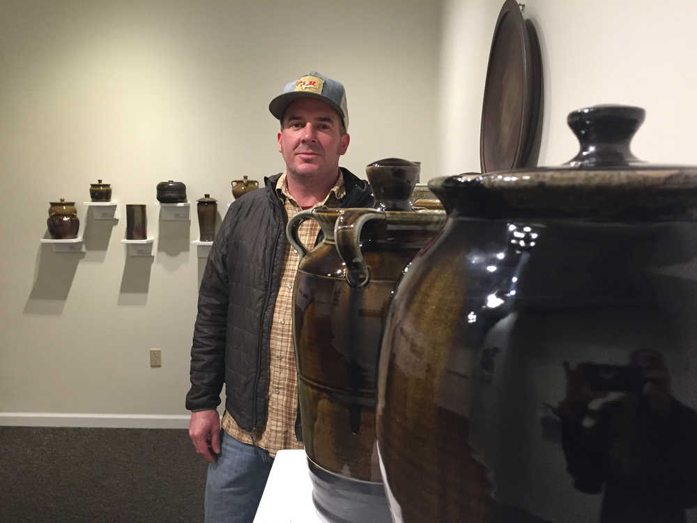 University of Alaska Southeast associate professor of art Jeremy Kane stands with some of his creations for "Surface," a show at the Juneau-Douglas City Museum. Kane, whose work is usually retro and Americana-focused, went back to his wood-firing roots for this particular show. Colors, and variations in surface texture, in the pieces are created by what he put in the kiln when they were being fired.