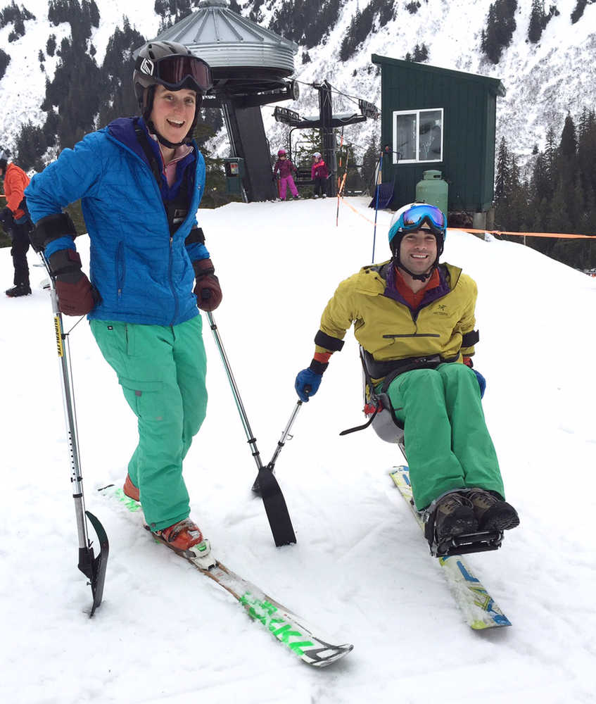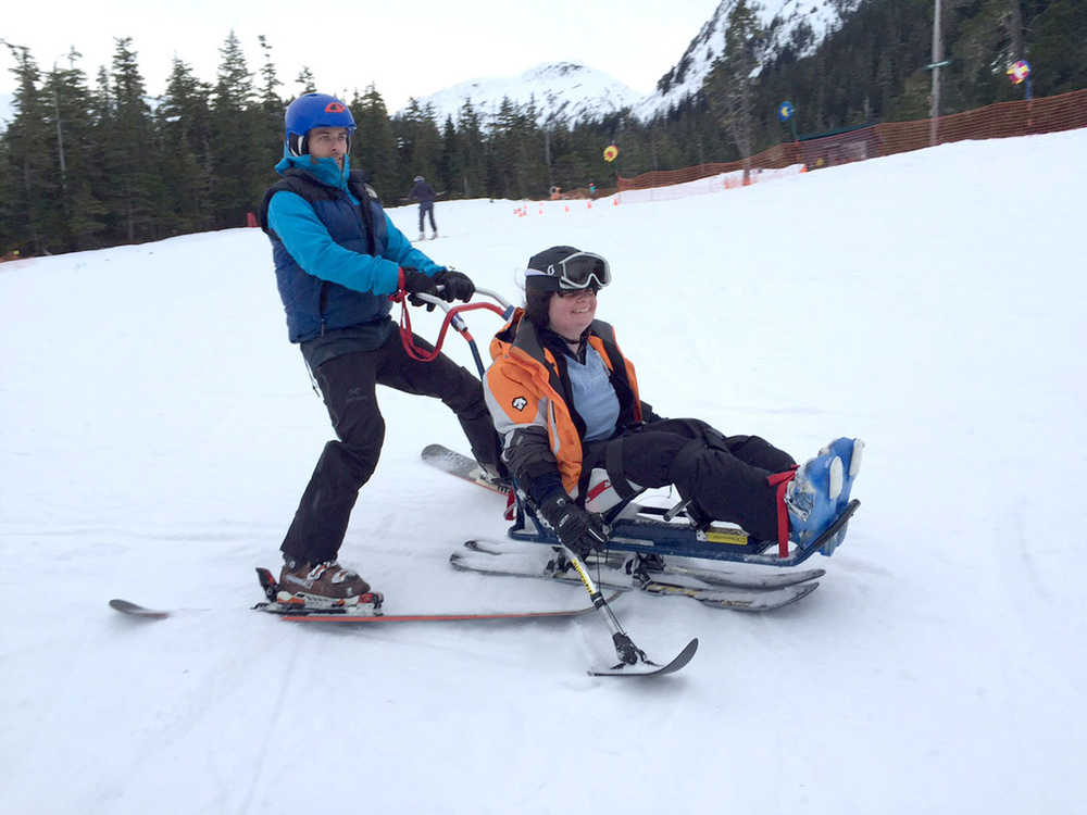 Outdoor Recreation and Community Access (ORCA) adaptive instructors Megan Ahleman and Sean O’Neill demonstrate how to use stand-up outriggers and a mono ski, adaptive equipment Southeast Alaska Independent Living (SAIL)’s ORCA program had on hand for Adaptive Day with Eaglecrest Ski Area on Jan. 17.