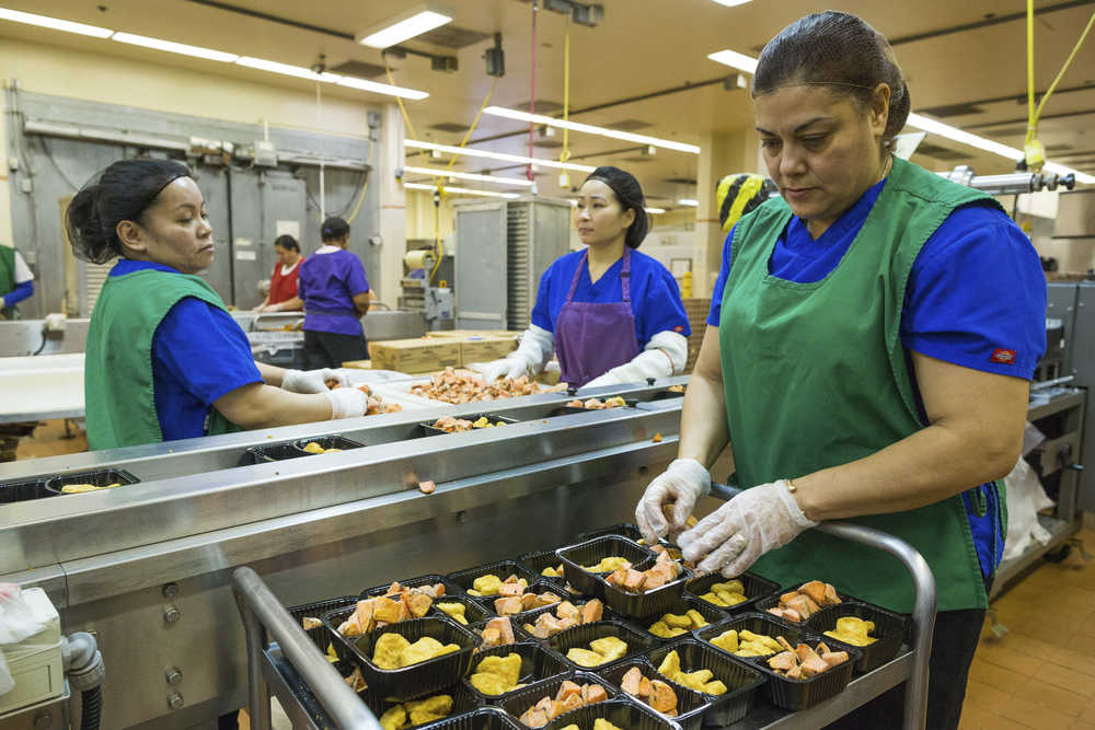 Two women in plastic gloves scooped handfuls of the potatoes into small plastic trays that moved on a conveyer belt. In the other half of the tray, employees put five chicken nuggets. A machine at the end of the belt wrapped the trays in plastic.