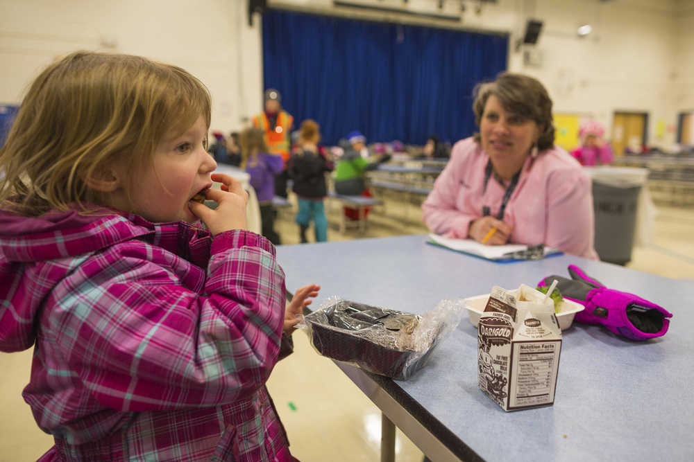 On Thursday, a line of students formed in Huffman Elementary School’s cafeteria in south Anchorage. More filled tables with the lunches they packed.