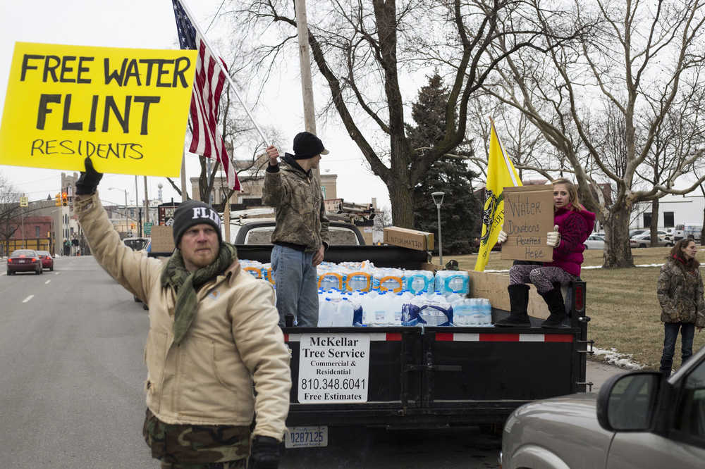 Genesee County Volunteer Militia members and protesters gather for a rally outside of Flint City Hall on Sunday Jan. 24, 2016, over the city's ongoing water crisis. The militia was handing out free bottled water and water filters. (Conor Ralph/The Flint Journal - MLive.com via AP)