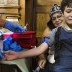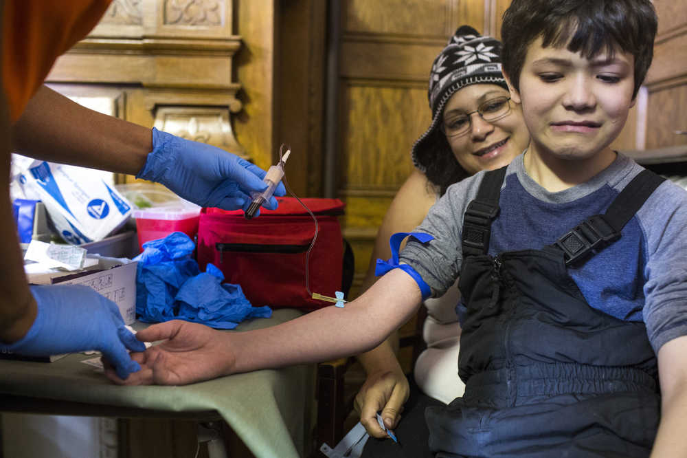 Flint resident Mycal Anderson, 9, reacts to having his blood drawn for lead testing while sitting on his mother Rochelle Anderson's lap at the Flint Masonic Temple on Saturday, Jan. 23, 2016 in Flint, Mich. The event was organized by Herb Sanders of Sanders Law Firm in Detroit, Mich., Change Agent Consortium, Rev. David Bullock, and Mothers of Murdered Children. Following blood drawings by Quest Diagnostics, residents should know their results in 7-14 business days. (Conor Ralph/The Flint Journal-MLive.com via AP)