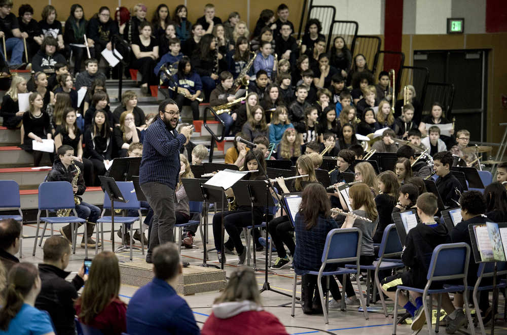 Artist-in-residence Edward Littlefield directs Floyd Dryden Middle School music students during an assembly on Friday. 'Telling Our Stories: Voices on the Land' is a residency sponsored by Sealaska Heritage Institute that allowed Littlefield to explore culture and music with over 180 students during the three week program.