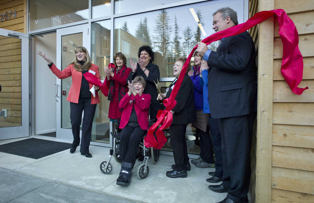Dignitaries celebrate a ribbon cutting during the grand opening of the Terraces at Lawson Creek housing facility on Douglas Island on Wednesday. Phase one, with 40 units, was recently completed with one, two and three-bedroom units with an on-site community center. Groundbreaking for phase two is expected this spring for another 35 units.The project is run by Volunteers of America Alaska and received additional funding from the Alaska Housing Fnance Corporation and the Rasmuson Foundation. From left: Robin Keller, of Volunteer of Amercia Inc., Sen. Lisa Murkowski, Diane Kaplan, CEO of the Rasmuson Foundation, Mayor Mary Becker, Elaine Dahlgren, President/CEO of Volunteers of American Alaska, Debbie Boiney, of the Rasmuson Foundation, and Bryan Butcher, CEO of the AHFC.
