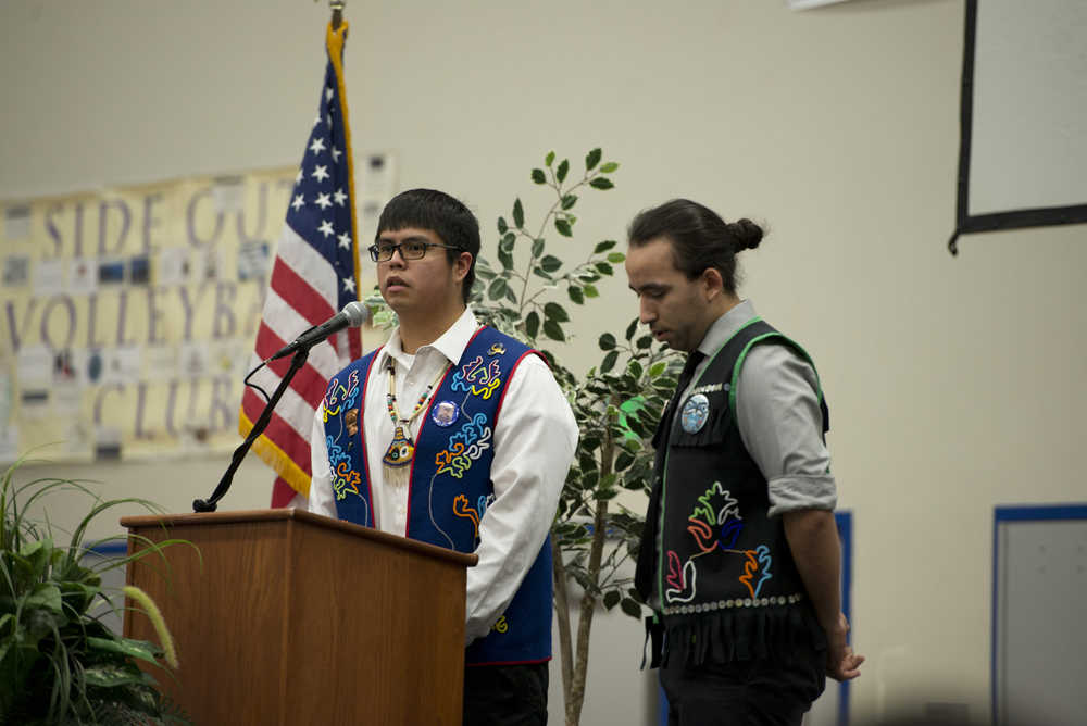 Cultural Specialist Paul Marks, left, and English teacher Mike Hoyt speak to a group of students at Thunder Mountain High School Thursday during an event that honored Alaska Native civil rights leader Elizabeth Peratrovich. The event featured guest speakers from Lt. Gov. Byron Mallott to Alaska Native storyteller and poet Ishmael Hope, and others, who spoke about Peratrovich’s life, the lasting importance of her efforts, and the political and legal implications of the Anti-Discrimination Act, which Peratrovich was instrumental in passing.