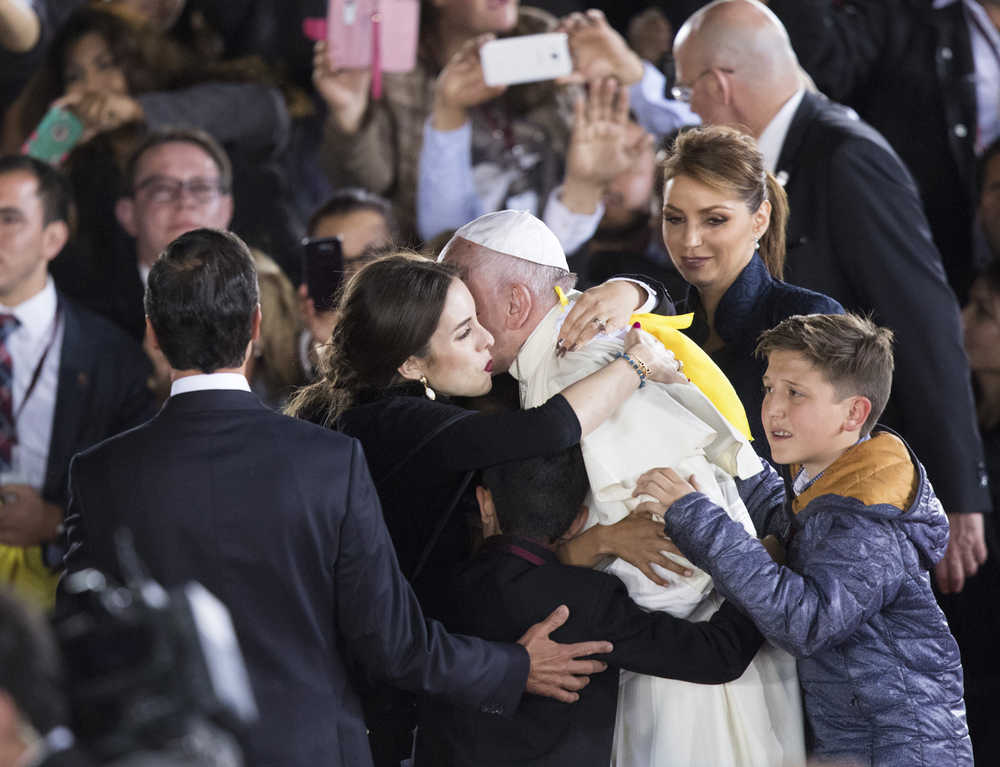 Flanked by Mexico's President Enrique Pena Nieto and first lady Angelica Rivera, Pope Francis is embraced by children on his way to a staging area, for a farewell ceremony, before his departure, at the Abraham Gonzalez International Airport in Ciudad Juarez, Mexico, Wednesday, Feb. 17, 2016. Francis returned to Italy after a five-day visit in Mexico. His plane took off from the border city of Ciudad Juarez after night fell Wednesday. (AP Photo/Ivan Pierre Aguirre)