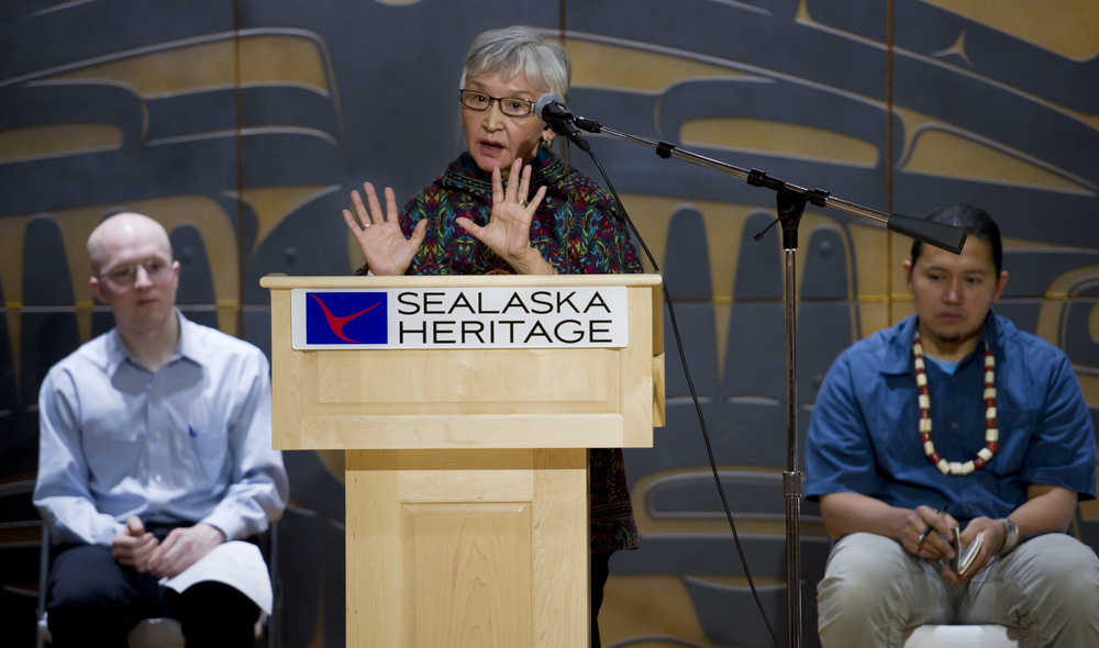 Edna MacLean, Commissioner of Iñupiat History, Language, and Culture for the North Slope Borough, speaks at the Alaska Language Summit at the Walter Soboleff Building on Tuesday. Rep. Jonathan Kreiss-Tomkins, D-Sitka, left, and X̱unei Lance Twitchell, Assistant Professor of Alaska Native Languages at the University of Alaska Southeast, listen on stage in the Shuká Hit Clan House.