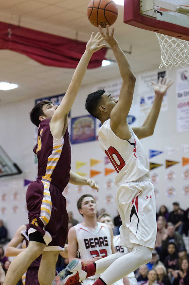 Juneau-Douglas's Molo Maka lays it up against Ketchikan's Jake Smith during their game Friday night at JDHS. Juneau won 72-64.