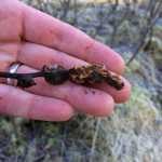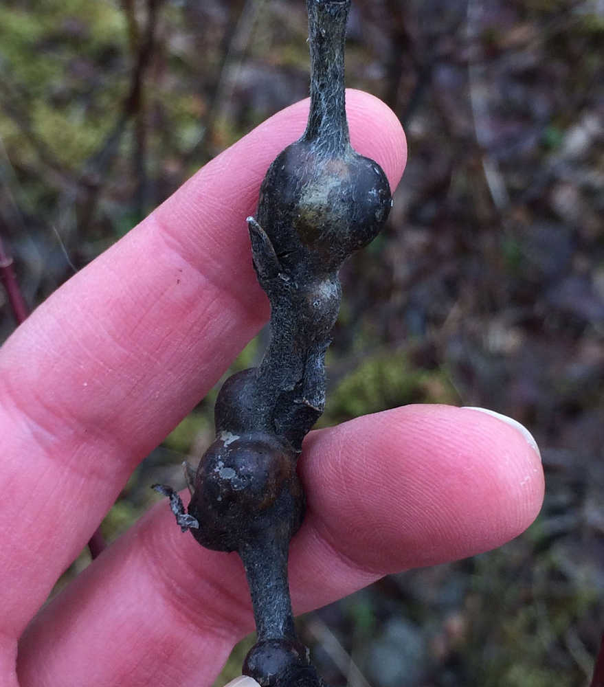 Other critters have been at work on the willows, too. There were many round galls — growths or lumps — on the remaining twigs. I was informed that this gall-maker is a midge, but not the same species as the one that makes ‘willow roses.’ Some of these round galls had exit holes, where a mature adult midge had emerged, after spending its larval life inside. A few galls were intact, but many of them had openings torn in the side of the gall, exposing the interior. We guessed, and this was later confirmed by a local naturalist, that these excavations were made for foraging chickadees. How do they know that there is an edible morsel inside the gall? Do they hear it as it eats through the plant material? Do they know from opening other structures that this kind also might have snacks inside? Once an excavation is rewarded by a tasty grub, I’d bet that the excavating chickadee quickly repeats the activity in search of more rewards.